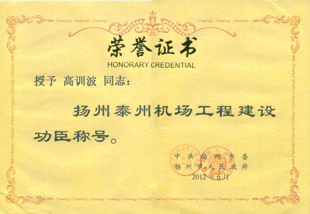 熱烈祝賀高訓(xùn)波同志喜獲“揚州泰州機場建設(shè)功臣”榮譽稱號
